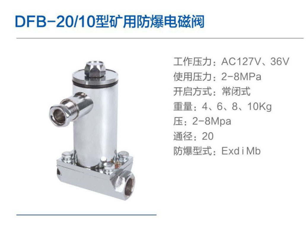 DFB20/10矿用隔爆型电磁阀(以下简称电磁阀),适用于煤矿井下有瓦斯、煤尘爆炸性气体环境中,与综保监控仪配套,(也可用于其它电控装置配套),作为喷雾除尘,降温及灭火流水控制用。