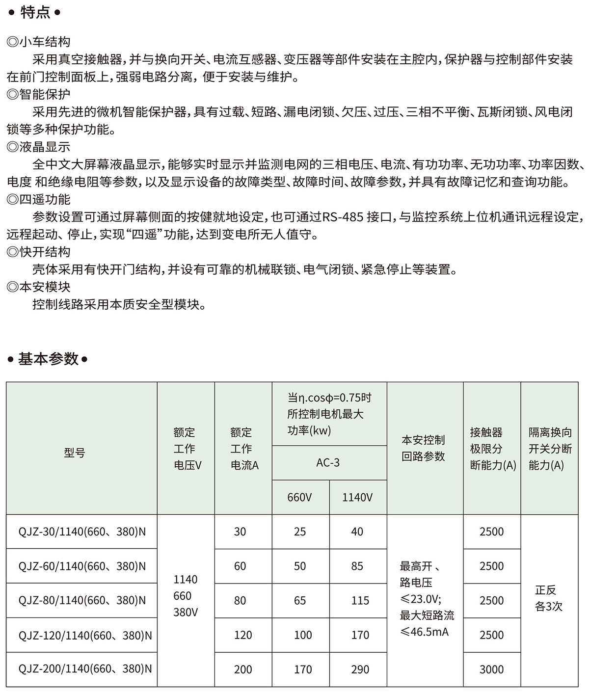 矿用隔爆兼本质安全型可逆真空电磁起动器QJZ-60/1140(660、380)N